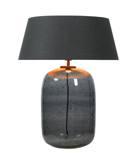 Tafellamp van handgeblazen donker glas met een lichte structuur.