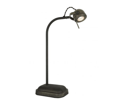 Metalen tafellamp in loodkleur met aan/uit knop, inclusief kap en GU10 led lampje.